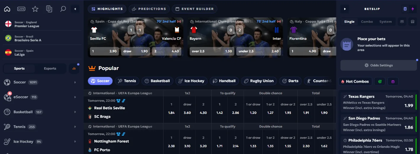 The sportsbook covers football, MMA and esports as core markets, with additional sports available. Both pre-match and live in-play betting are supported, alongside features like Bet Builder and Early Payout. Market availability may vary depending on current events.